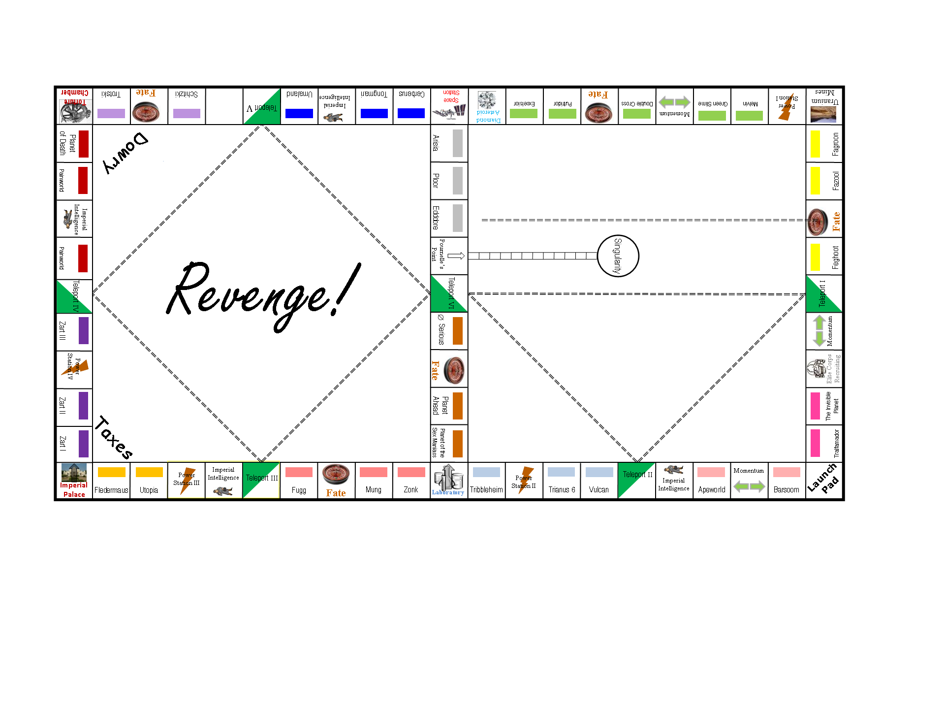 Vulchurella's groom takes her on a honeymoon of two clockwise turns around the board. You may use either the short route (via the Space Station to Laboratory leg) or the long route (via the Uranium Mines to Launchpad leg). Neither the groom nor the bride may teleport. Vulchurella moves one square behind the groom (symbolized by a ring). She cannot buy property or collect cards. He pays rent for both of them out of his own funds; he cannot use the Dowry until the honeymoon is over. If other players play cards on him, she follows, one step clockwise behind him. The Laboratory Geas does not apply, and the groom may pass free through the Torture Chamber.